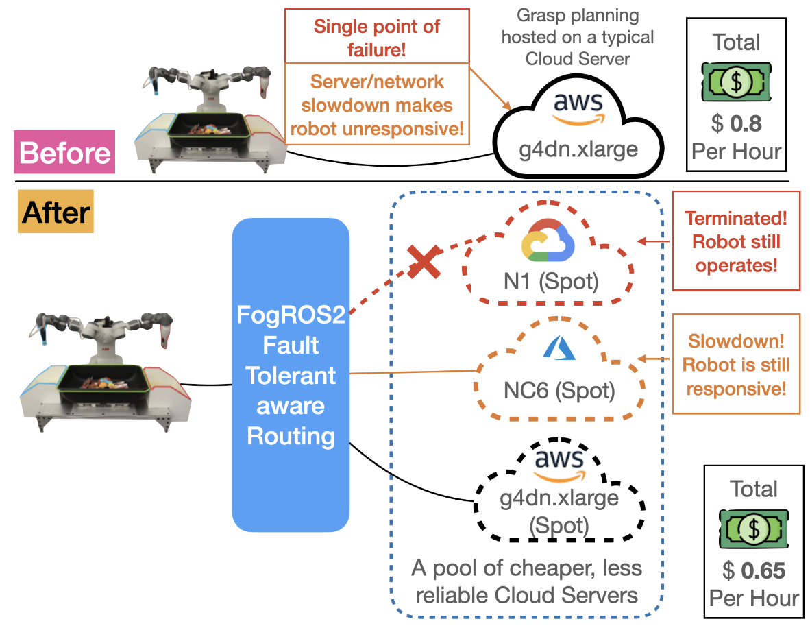 ![]() | FogROS2-FT: Fault Tolerant Cloud Robotics Kaiyuan Chen, Kush Hari, Trinity Chung, Michael Wang, Nan Tian, Jeffrey Ichnowski, Christian Juette, Ren Liu, John Kubiatowicz, Ion Stoica, Ken Goldberg |